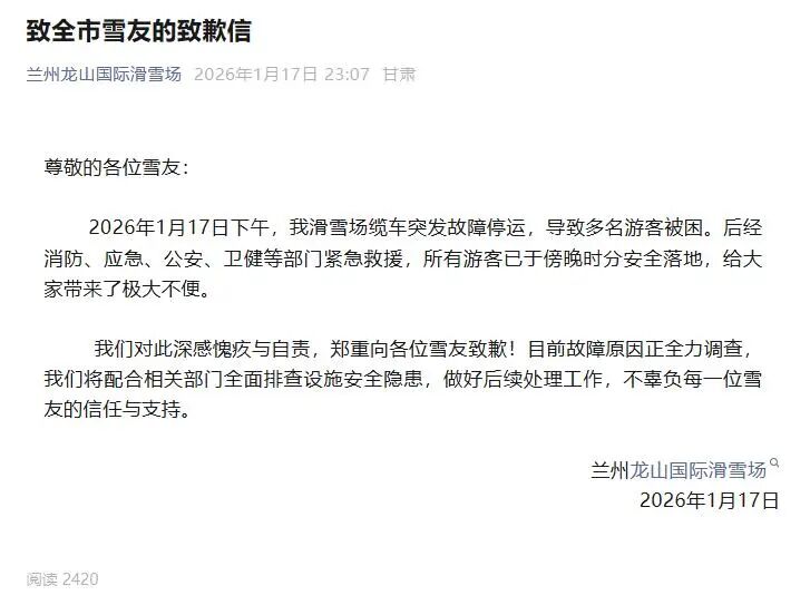 17日23时07分赏金国际开户,龙山滑雪场通过微信公众号就此事致歉,称对此事件深感愧疚和自责,并表示目前故障原因正全力调查,将配合相关部门全面排查安全隐患,做好后续处理工作。